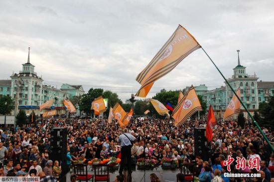 资料图:5月12日,乌克兰东部顿涅茨克州和卢甘斯克州宣布,根据全民公决结果宣布脱离乌克兰成为“主权国家”。图为卢甘斯克州亲俄民众集会庆祝。