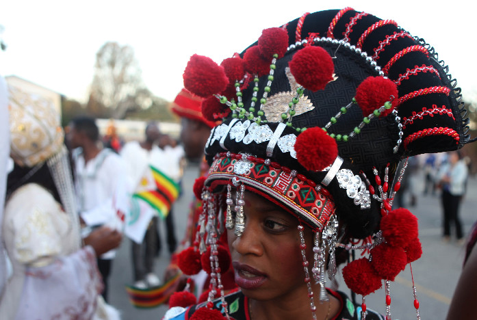 15日,在津巴布韦大学校园内,一名身着中国少数民族服装的津巴布韦人在音乐嘉年华上游行。费列萌摄
