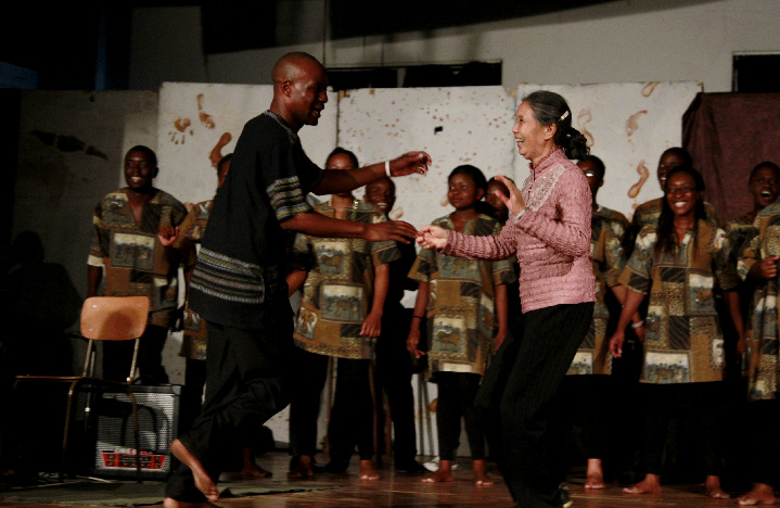15日晚,在津巴布韦大学贝特大礼堂内,一名中国观众与津巴布韦舞者共舞。记者许林贵摄