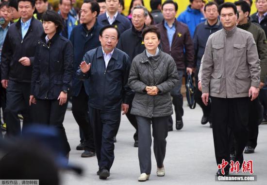 当地时间5月4日,韩国珍岛,韩国总统朴槿惠重返沉没客轮救援现场,询问搜救人员的救援情况。