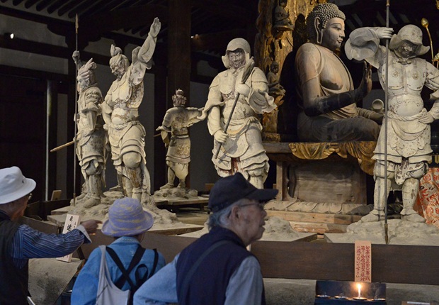 【环球网综合报道】据日本《产经新闻》5月16日报道,日本奈良市高畑町新药师寺正殿近日引入可模拟再现日光效果的LED照明系统。以往在荧光灯下无法被注意到的佛像投影,在新的照明系统下清晰地映入游人眼前,殿内气氛也更加庄严神圣,不少参拜者对此也是大为好评。