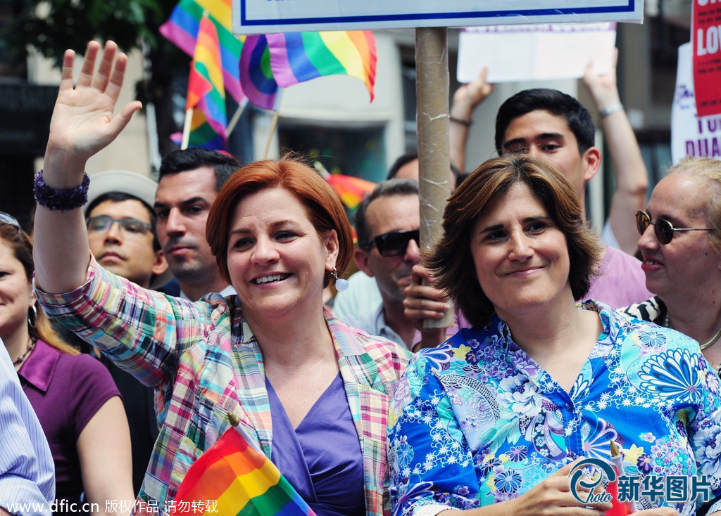 当地时间2012年6月24日,美国纽约,纽约市议长柯魁英(左)与同性伴侣金-卡图洛参加第43届同性恋大游行。来源:东方IC