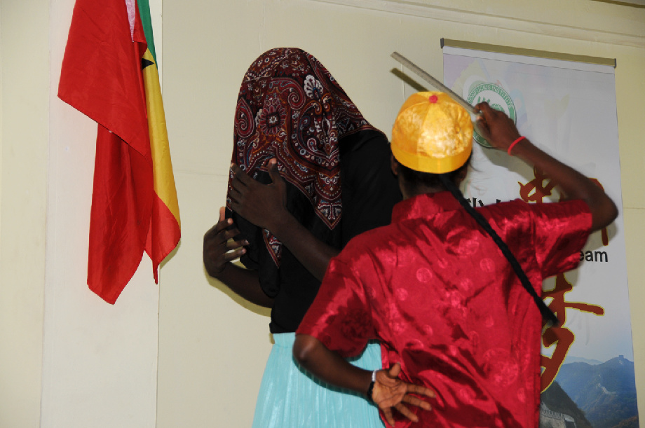 5月17日,第13届“汉语桥”世界大学生中文比赛加纳赛区预赛在加纳大学孔子学院隆重举行,比赛主题是“我的中国梦”。这是“汉语桥”比赛第一次走进加纳,同时也是加纳大学孔子学院揭牌周年纪念日。来自加纳4所高校的13名学生参加了比赛,经过自由演讲、才艺展示、知识问答等环节的激烈角逐,来自加纳大学的一休和赛娜思分获前两名。据悉,他们都将获得孔子学院的奖学金前往中国学习,并有机会参加全球“汉语桥”大赛总决赛。本次比赛的评委之一、中国驻加纳大使孙保红表示,中国和加纳近年来在人力资源领域合作密切,孔子学院将为中加友谊和人才交流提供更为坚实的桥梁。来自加纳多所高校的教师代表和百余名学生出席了颁奖典礼,并观看了精彩的文艺表演。(记者林晓蔚摄)