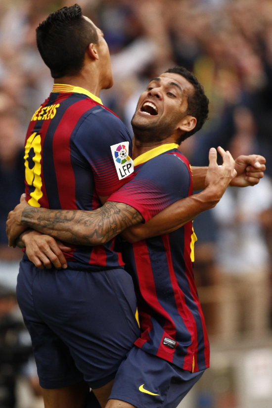 5月17日的比赛上半场,桑切斯取得进球后,巴萨球员在场上庆祝。
