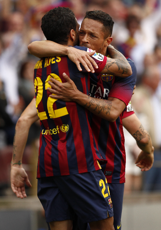 5月17日的比赛上半场,桑切斯取得进球后,巴萨球员在场上庆祝。
