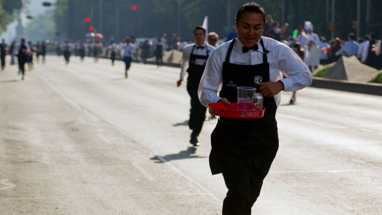 服务生进行800米托盘竞走表演(网页截图)