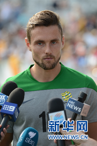 澳大利亚国家足球队中场球员詹姆斯·霍兰德18日在澳大利亚新南威尔士州戈斯福德蓝舌球场举行的球迷见面会和公开训练日上接受媒体采访。(钱军 摄)