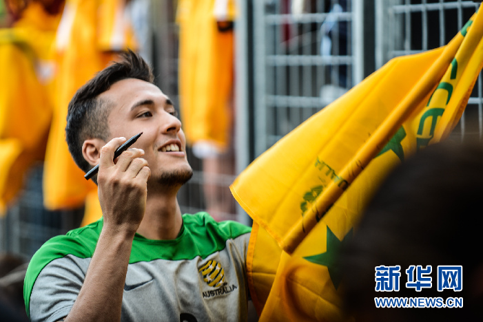 澳大利亚国家足球队后卫贾森·戴维森18日在澳大利亚新南威尔士州戈斯福德蓝舌球场举行的球迷见面会上为球迷签名。(钱军 摄)