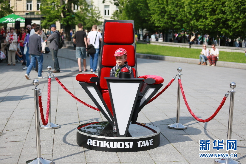 5月17日,在立陶宛首都维尔纽斯,一名儿童坐在“立陶宛好声音”导师转椅上(转椅上立陶宛语译为:我选择你)。