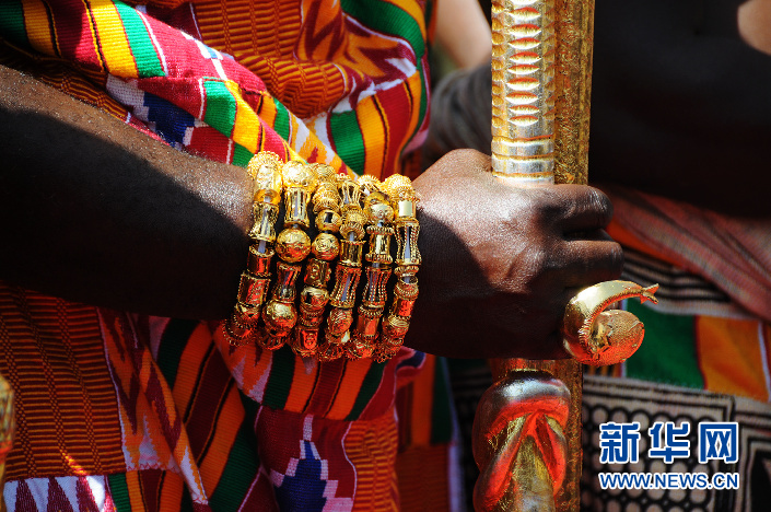阿散蒂人是加纳主要民族之一,17至18世纪曾在西非建立强大的阿散蒂王国。阿散蒂国王是加纳传统权威第一人,在该国拥有至高无上的地位,庆典当天加纳前总统罗林斯、库福尔以及现任总统马哈马均到场表示祝贺。阿散蒂服饰具有鲜明的加纳传统特色,以当地著名的肯特布为主要原料,由于阿散蒂地区黄金蕴藏量巨大,人们非常喜欢将五彩斑斓的布料与大量黄金饰品搭配起来,视觉效果堪称灿烂。(记者林晓蔚 摄)