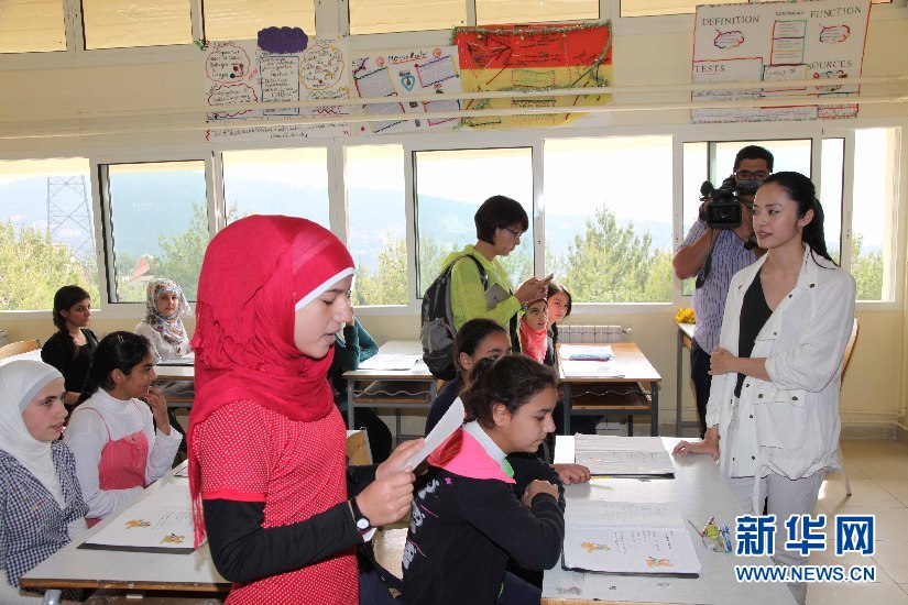 5月19日,联合国难民署中国亲善大使、中国知名演员姚晨前往黎巴嫩东南部的阿莱山区的一所名叫贝苏尔的公立学校,看望正在上课的叙利亚难民学生。(记者刘顺 摄)