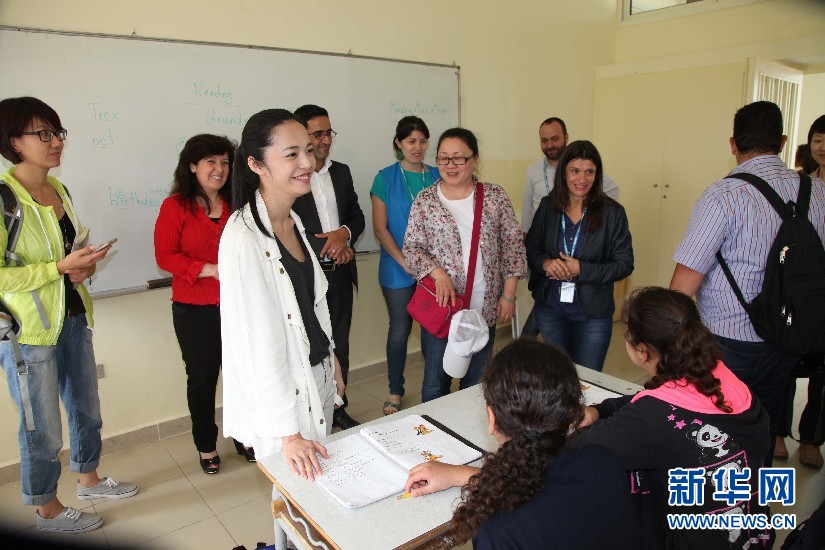 5月19日,联合国难民署中国亲善大使、中国知名演员姚晨前往黎巴嫩东南部的阿莱山区的一所名叫贝苏尔的公立学校,同叙利亚难民学生交谈。(记者刘顺 摄)