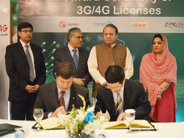 5月22日,巴基斯坦总理谢里夫(右三)为中国移动巴基斯坦公司董事长兼首席执行官范云军(右一)颁发3G和4G牌照。