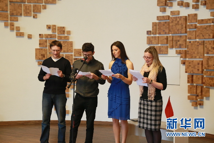 5月21日,在立陶宛首都维尔纽斯,米科拉斯·罗梅瑞斯大学部分中文学生在图片展现场演唱中国歌曲“快乐老家”。当日,中国驻立陶宛大使馆和米科拉斯·罗梅瑞斯大学共同举办“美丽中国”图片展。展出图片50余幅,向观众介绍了中国的风景、民俗、文化及发展成就等情况。(记者 卜鹏 摄)