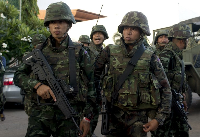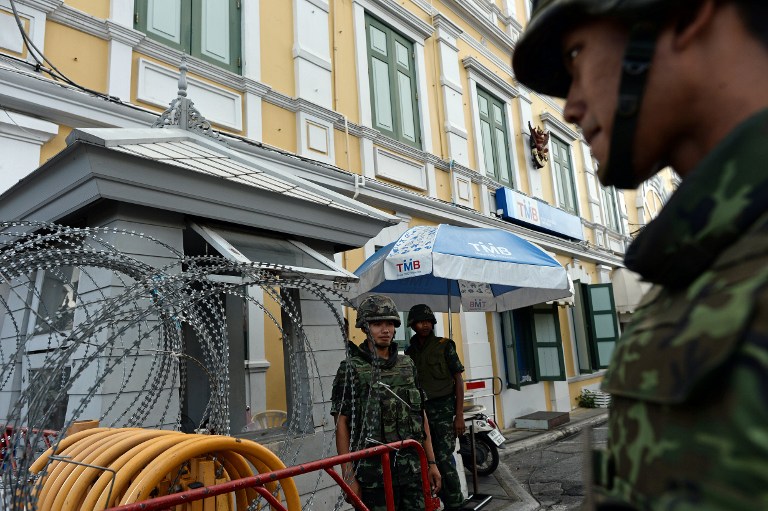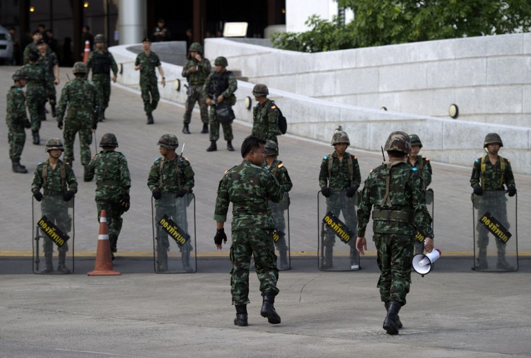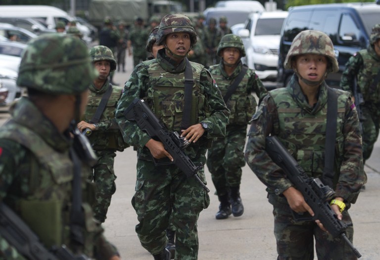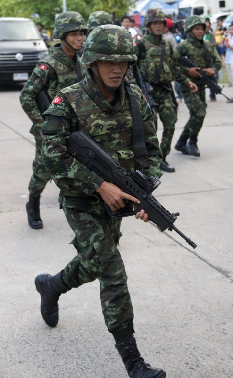 在泰国首都曼谷,泰国士兵在多方会谈的会场外巡逻。