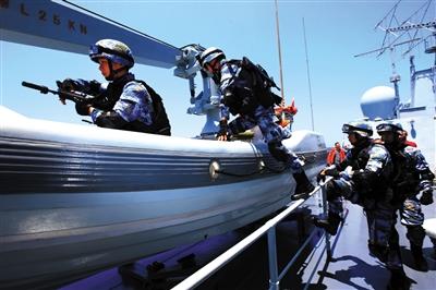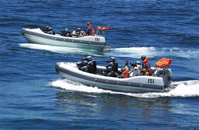 23日,中国海军特战队员接到命令登上小艇。新华社发