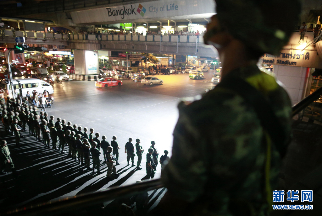 当地时间2014年5月23日,泰国曼谷,民众集会反对军方的政变行为,泰国士兵在街头巡逻严阵以待。据悉泰国军方周五传召了所有政府和政党要员,试图为国家的长期动荡强行划下句号。来源:东方IC