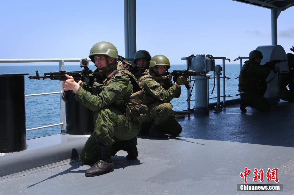 5月23日,中俄“海上联合—2014”解救被劫船舶演练中,中俄双方特种队员携手解救被劫船舶。11时许,在演练“联合解救被劫持船舶”中,双方两个特战小组分别从郑州舰、“瓦良格”号导弹巡洋舰乘快艇突击至“被劫持商船”上。特战队员们掩护前进,最终将10名海盗击毙或擒获。中俄“海上联合-2014”军事演习23日在预定海域全面展开,双方参演部队组成混合编队,演练联合护航、联合解救被劫持船舶、联合查证识别、联合防空和联合对海突击等多个课目。中新社发琚振华 摄