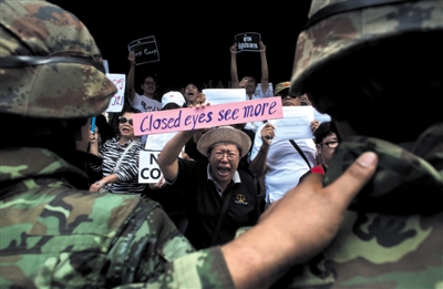24日,曼谷,民众举行游行示威反对政变。