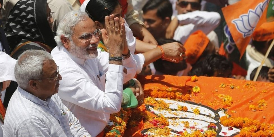 在刚刚结束的印度下议院选举中,人民党在543个席位中占据了282席。此前人民党候选人莫迪展开了十分出色的竞选活动,功不可没。图为2014年4月24日,莫迪与其支持者集聚在印度东北部城市瓦拉纳西(网页截图)