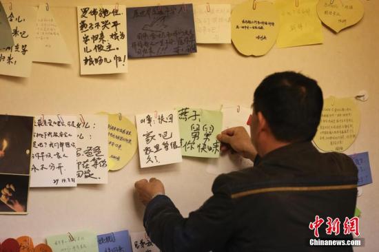 资料图:4月1日,家属在祈祷室内的祈祷墙前。中新社发 熊然 摄