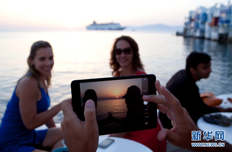 5月26日,在雅典东南约150公里的希腊著名岛屿米克诺斯岛(Mykonos),外国游客在拍摄夕阳下的留影。新华社记者 刘咏秋 摄