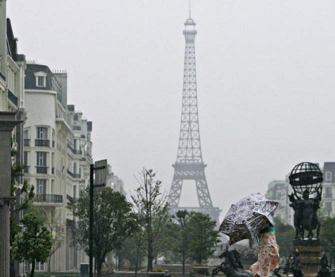 2007年9月,杭州郊区,一名女子从一个埃菲尔铁塔的复制品前面路过。(资料图片 来源网络)