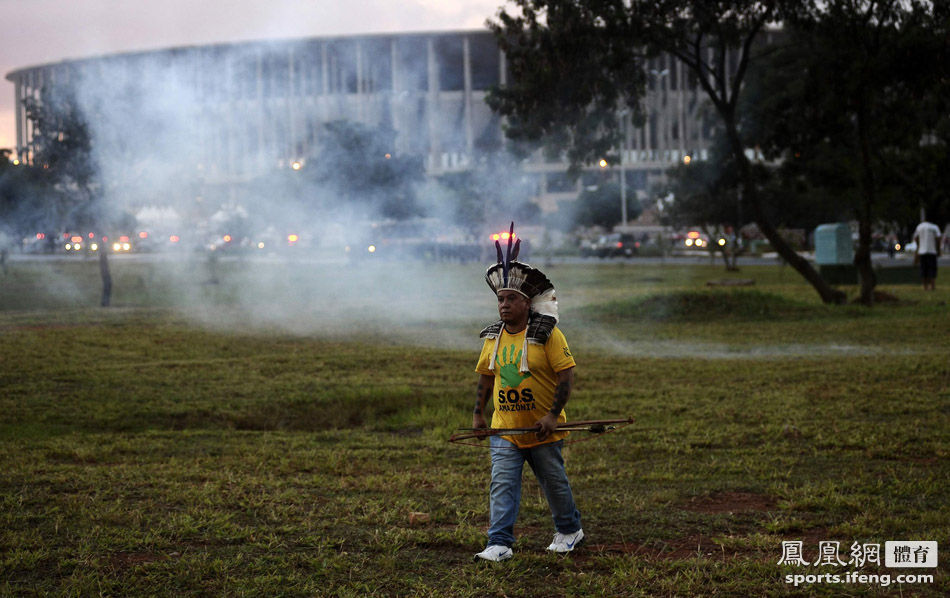 5月27日,在巴西首都巴西利亚市,300多名穿戴传统土著服饰并配戴弓箭的土著居民上街游行抗议世界杯。当他们靠近巴西利亚国家足球体育场时,遭到警方拦截,双方发生冲突。