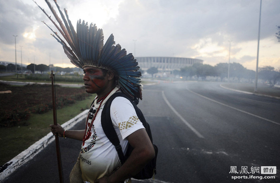 5月27日,在巴西首都巴西利亚市,300多名穿戴传统土著服饰并配戴弓箭的土著居民上街游行抗议世界杯。当他们靠近巴西利亚国家足球体育场时,遭到警方拦截,双方发生冲突。