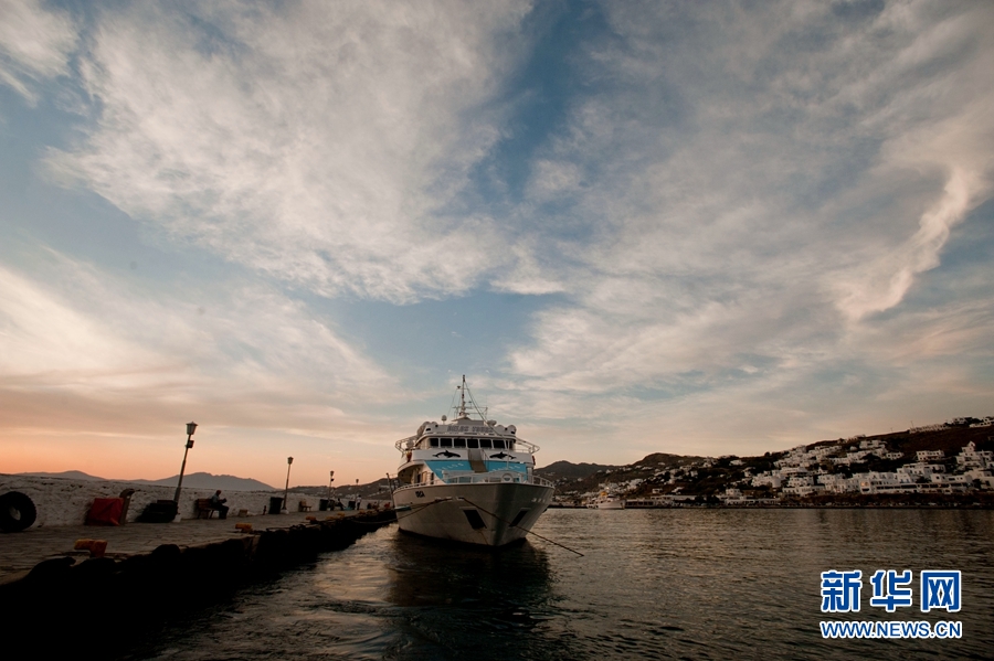 5月28日,在雅典东南约150公里的希腊著名岛屿米克诺斯岛(Mykonos),渡船停泊在米克诺斯镇港口,准备把游客送到邻近的世界文化遗产提洛岛。新华社记者 刘咏秋 摄