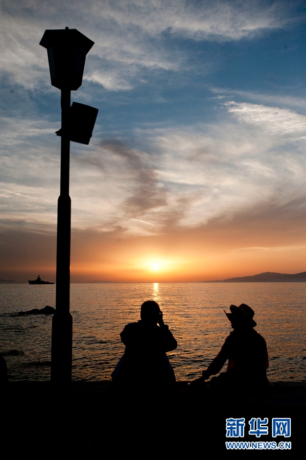 5月28日,在雅典东南约150公里的希腊著名岛屿米克诺斯岛(Mykonos),游客沉醉在迷人的夕阳中。新华社记者 刘咏秋 摄