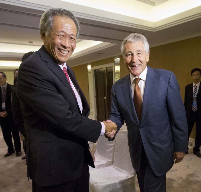 美国防长查克·哈格尔(右)与新加坡国防部长黄永宏(左)在香格里拉对话会前握手。(供图:东方IC)