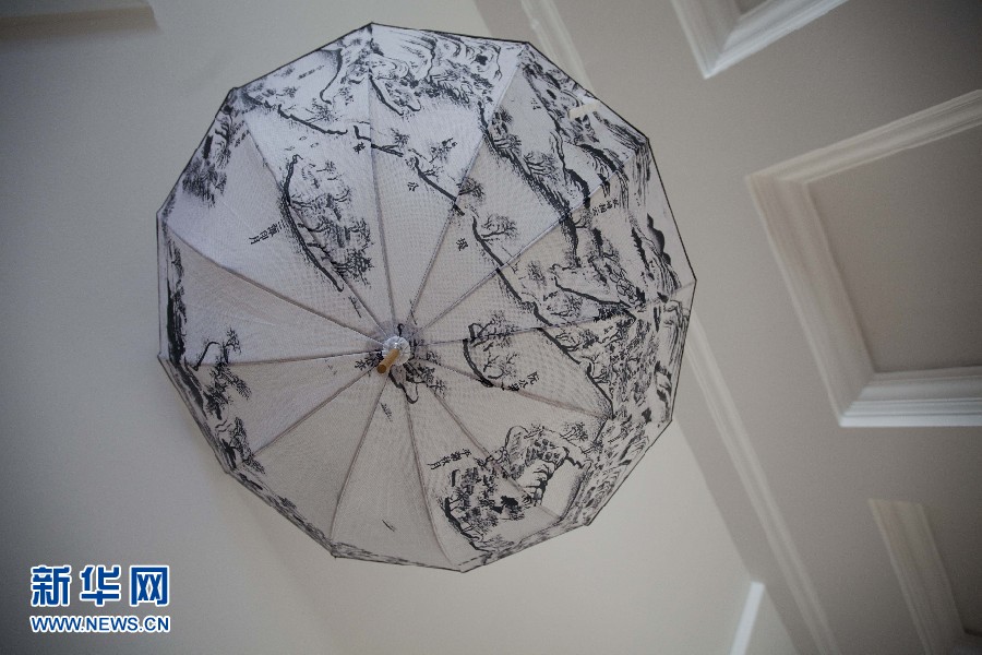 图为10日所拍摄的“融▪工艺设计生活”设计展上的一把糊伞。