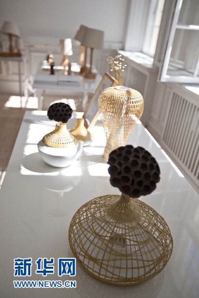 图为10日所拍摄的“融▪工艺设计生活”设计展上用竹条编织的花瓶。