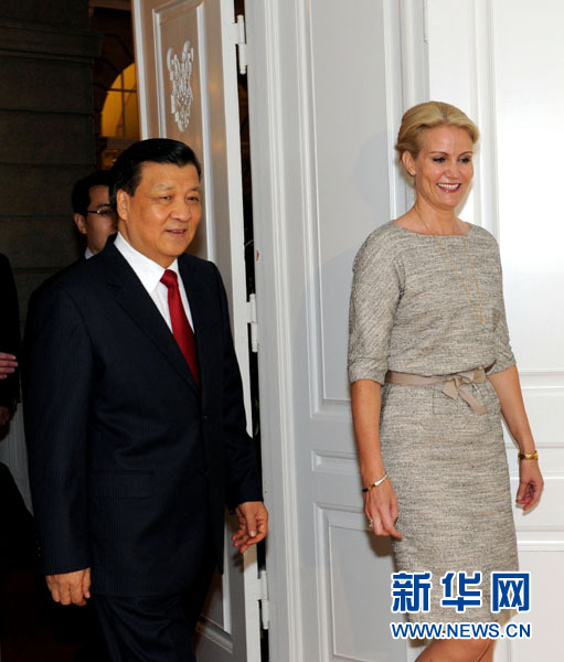 6月11日,正在丹麦进行正式访问的中共中央政治局常委、中央书记处书记刘云山在哥本哈根会见丹麦首相、社民党主席托宁-施密特。 新华社记者饶爱民 摄