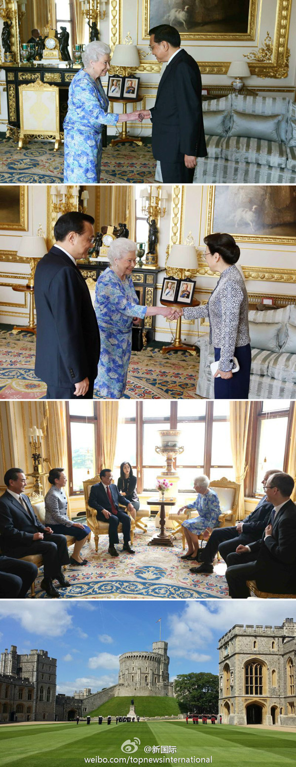 新华网北京6月17日电 据新华社“新国际”微博报道, 国务院总理李克强17日上午在温莎宫会见英国女王伊丽莎白二世。李克强说,中英两国堪称东西方文明的代表,我们愿与英方互学互鉴。中国欢迎英国王室成员多到中国走一走,看一看。女王愉快回忆起1986年访华时情景,称中国之行给她留下深刻印象。