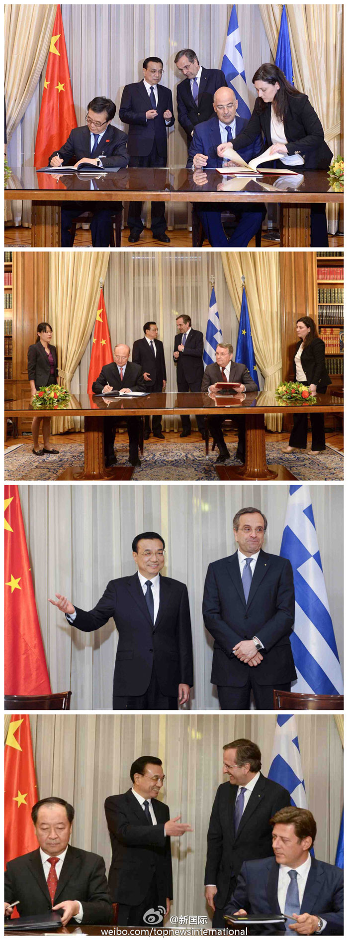 新华网北京6月20日电 据新华社“新国际”微博,报道当地时间19日下午,国务院总理李克强与希腊总理萨马拉斯举行会谈后,两国总理共同见证了有关双边文化、经贸、投资、海洋、防灾、基础设施建设等领域合作文件的签署。
