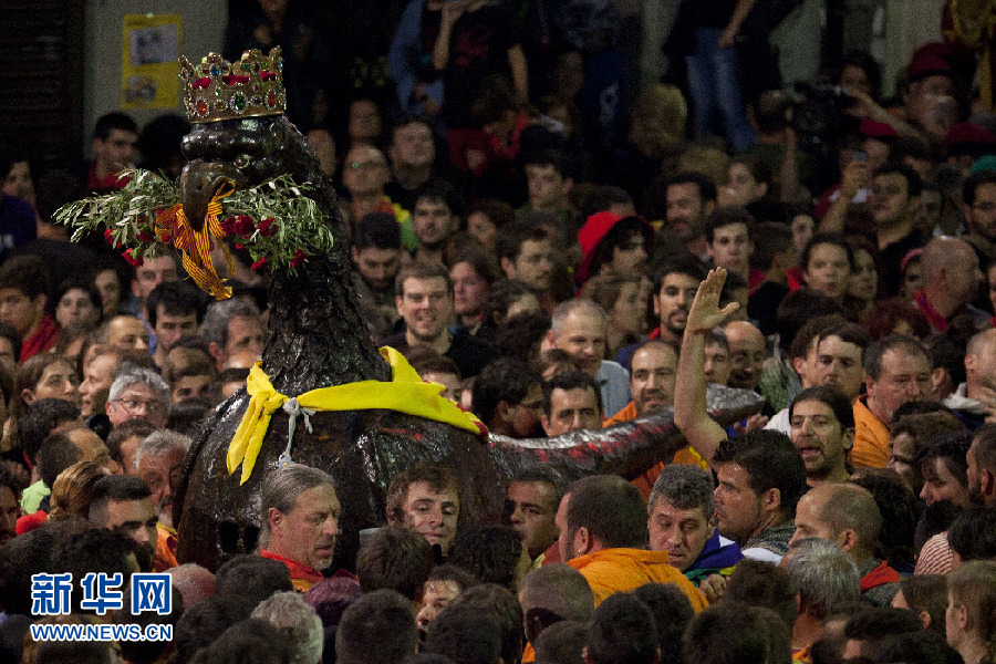 西班牙贝尔加(Berga)市的La Patum节上,头戴皇冠的老鹰玩偶穿过狂欢的人群。