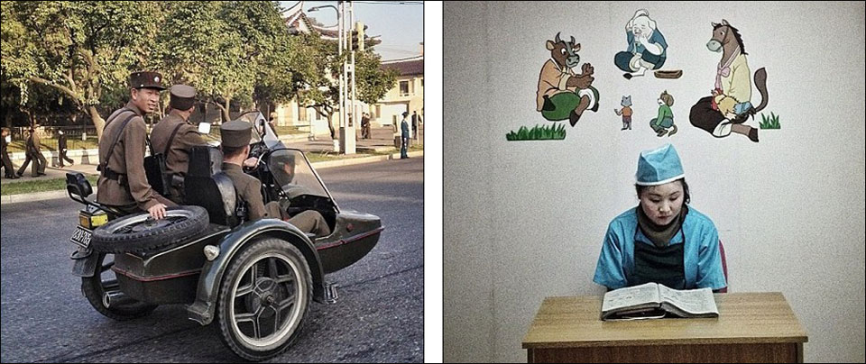 古登菲尔德打破朝鲜的隐秘面纱,揭开普通朝鲜人日常生活真实场景。左图是朝鲜士兵在进行日常巡逻,右图中一名朝鲜护士正在平壤儿童医院走廊中学习。(网页截图)