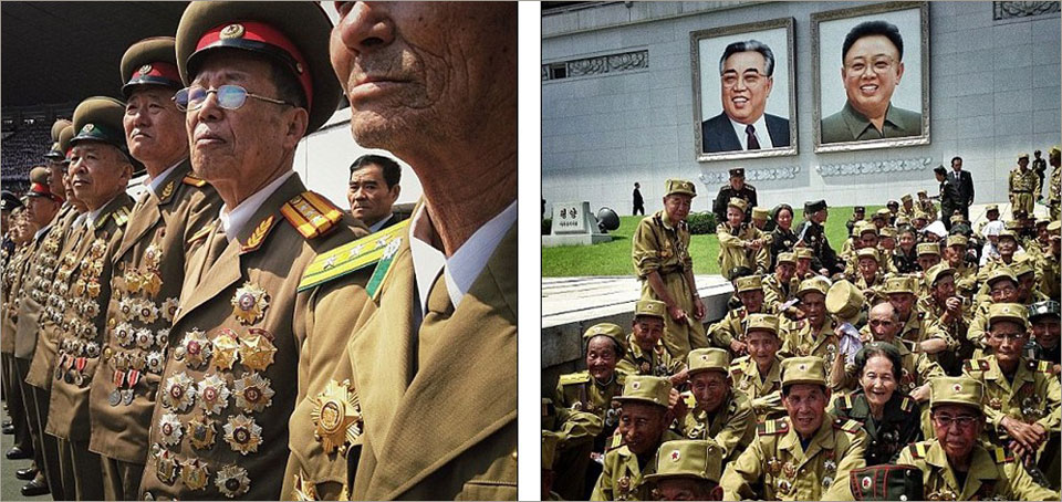 朝鲜为纪念朝鲜战争停战协议签署60周年举行大阅兵,左图是列队的退役军人,右图是退伍老兵坐在朝鲜已故领导人金日成和金正日肖像下。(网页截图)
