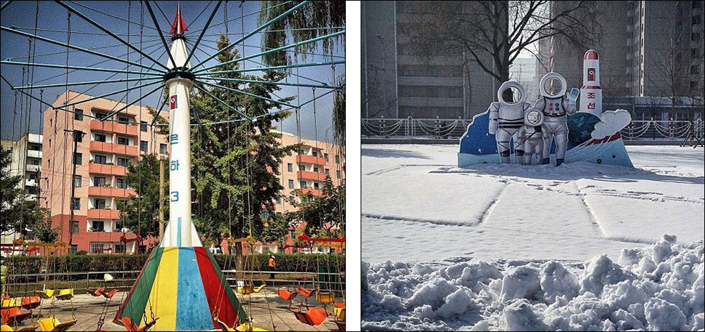 左图为朝鲜公园旋转轮。右图是被雪覆盖的小广场,展现类似“问候地球人”场景。(网页截图)