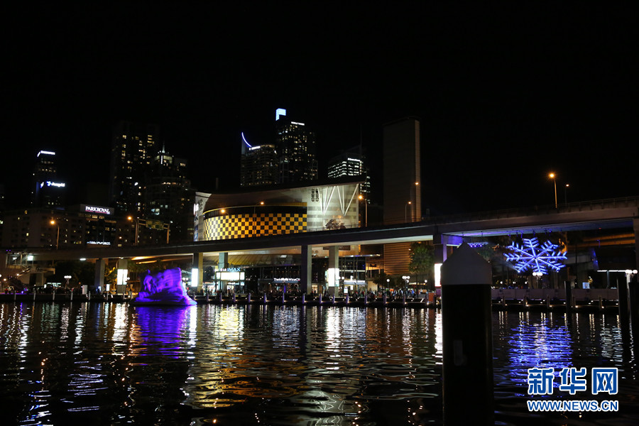 6月13日起,为期1个月的大型冬季冰雪活动在悉尼市中心的情人港(Darling Harbour)为悉尼市民冬季的生活增添了些许名副其实的冬季气氛。图为悉尼情人港被雪白的冰山和雪花装点,在夜晚灯光的点缀下生动熠熠。新华社记者 李冰 摄