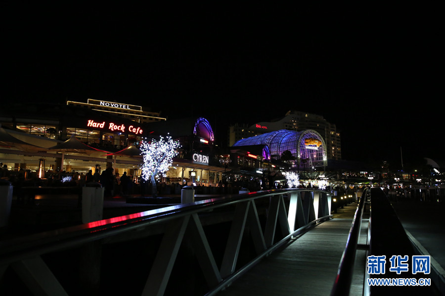 6月13日起,为期1个月的大型冬季冰雪活动在悉尼市中心的情人港(Darling Harbour)为悉尼市民冬季的生活增添了些许名副其实的冬季气氛。图为情人港岸边沿路的树灯。。新华社记者 李冰 摄