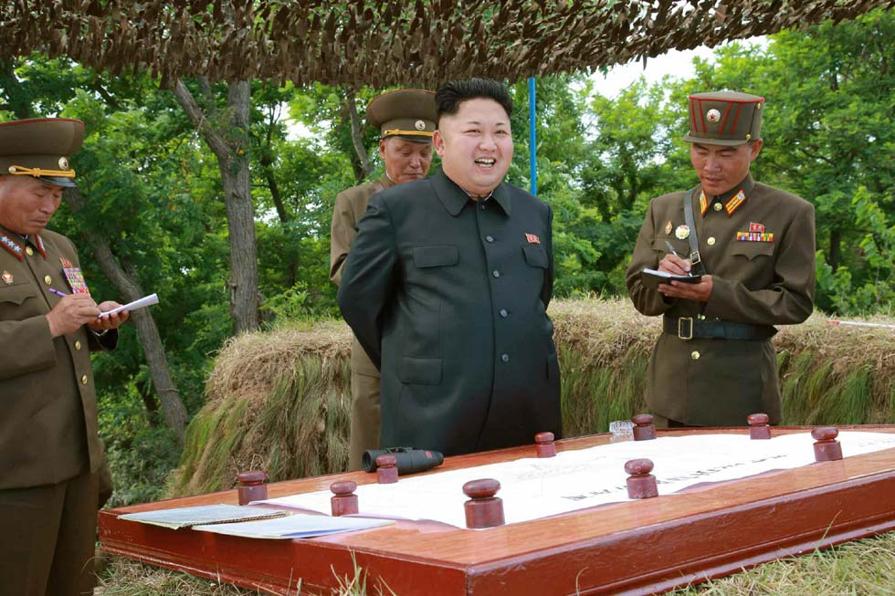 朝鲜领导人金正恩视察东海岸前方的岛屿哨所,指导炮击训练,并与士兵合影留念。