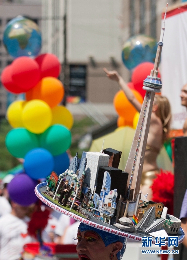 6月29日,在加拿大多伦多,一位头戴多伦多地标建筑模型帽子的狂欢者在游行中。新华网 邹峥摄