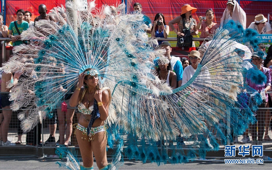 6月29日,在加拿大多伦多,一位狂欢者在游行中展示盛装。新华网 邹峥摄