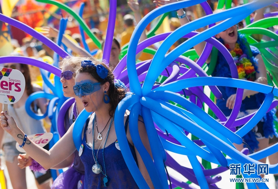 6月29日,在加拿大多伦多,狂欢者在游行中。新华网 邹峥摄