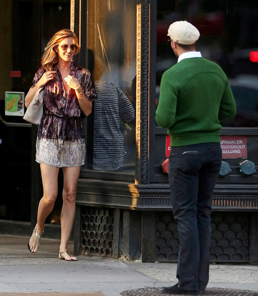 当天,吉赛尔身穿一款波西米亚风连衣裙,搭配一双金色T型凉拖,一个白色手提包,黑超遮面,显得十分随意。但衣服低胸的设计,隐隐而露的蕾丝内衣,短短的裙摆下露出的大长腿让这位超模一如既往地显得性感非常。而其丈夫汤姆则穿着一条宽松的黑色裤子,绿色针织衫露出打底的白色衬衣衣领,再戴着一顶70年代流行的白色报童帽,静静地站着,静候佳人。 (实习编译:欧灵霞 审稿:李宗泽)