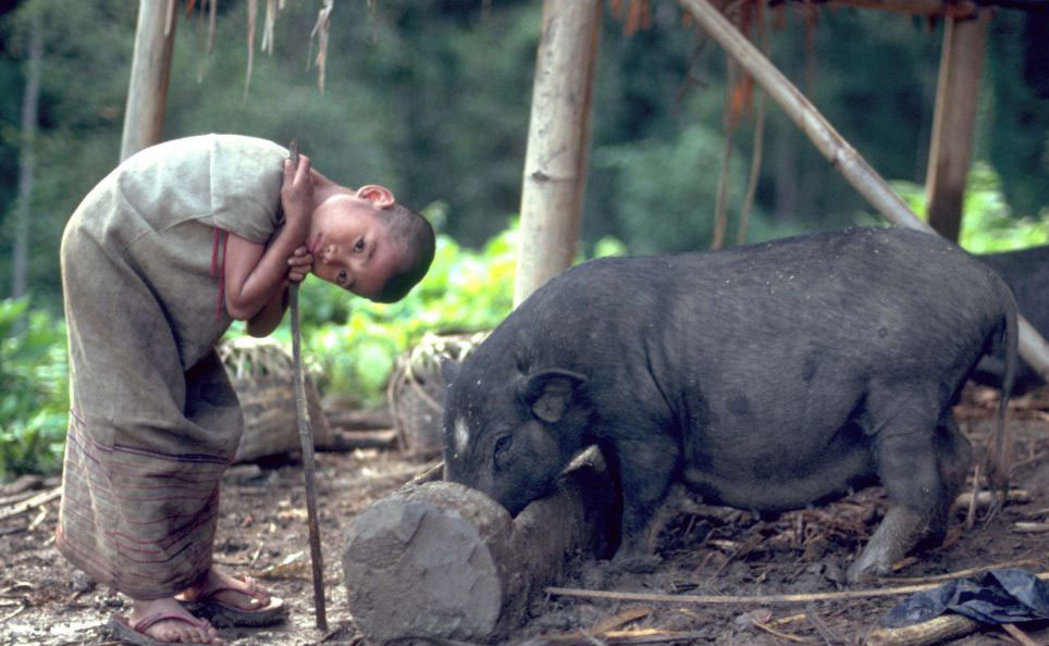 泰国北部隐世部落照片日前曝光,图为喂猪的男童。(网页截图)