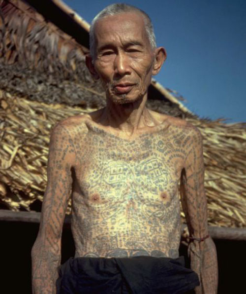 泰国北部隐世部落照片日前曝光,图为全身是纹身的老人。(网页截图)